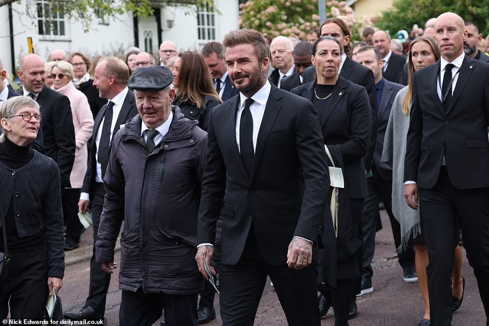 Hundreds of members of the congregation followed behind including the former England manager's captain David Beckham,Eriksson's longtime lover Nancy Dell'Olio and his partner Yaniseth Alcides.