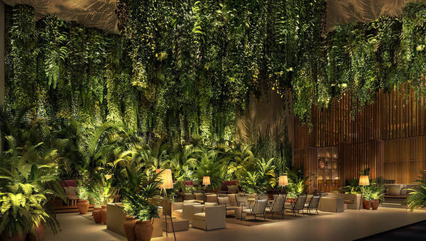 Beyond the lobby, an oversized lagoon-like swimming pool with floating cabanas continues the water concept, seemingly bringing the ocean into the hotel. A white-sand path connects the main buildings to the So'ol Beach Club, home to a second outdoor pool with an infinity edge. Edition said a bamboo structure that is the resort's yoga space appears to rise from the water and funnel back down into it.