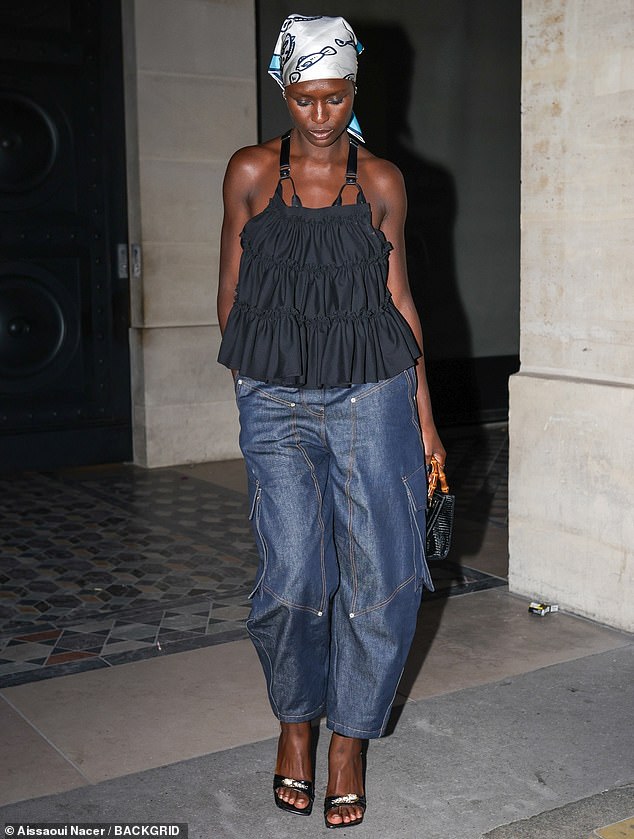 Jodie Turner-Smith looked beautiful in a silk headscarf and a baggy pair of cropped blue jeans as she left a late-night dinner at Hotel Costes in Paris on Monday night.