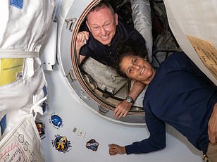 The crew will also perform nearly 40 scientific experiments including a test of new smart contact lenses which will take biometric readings from the astronauts. Pictured: Sarah Gillis wears a smart contact lens in her left (page right) eye