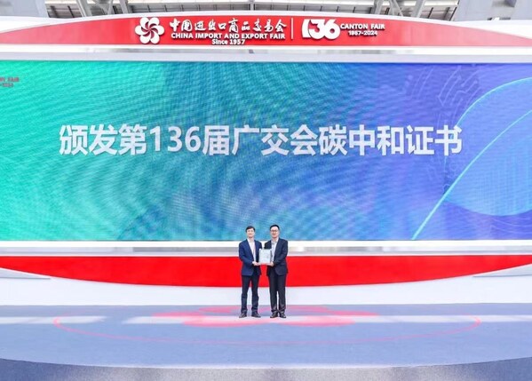 GUANGZHOU,China,Oct. 26,2024 -- As China's No.1 Fair,the Canton Fair is leading the drive in the exhibition industry to reduce carbon emissions and achieve the goal of hosting carbon-neutraltradeshows. At the "Green Space" event,Guangzhou Municipal Ecological Environment Bureau awarded a carbon neutrality certificate to the 136th Canton Fair.